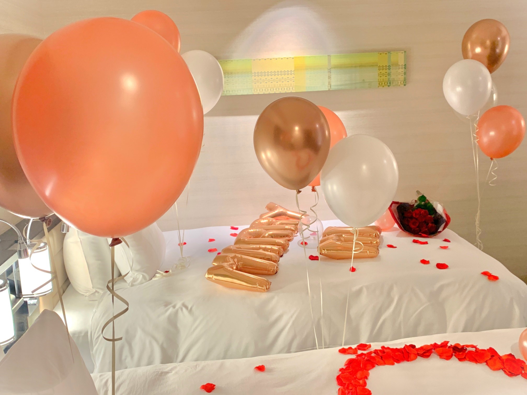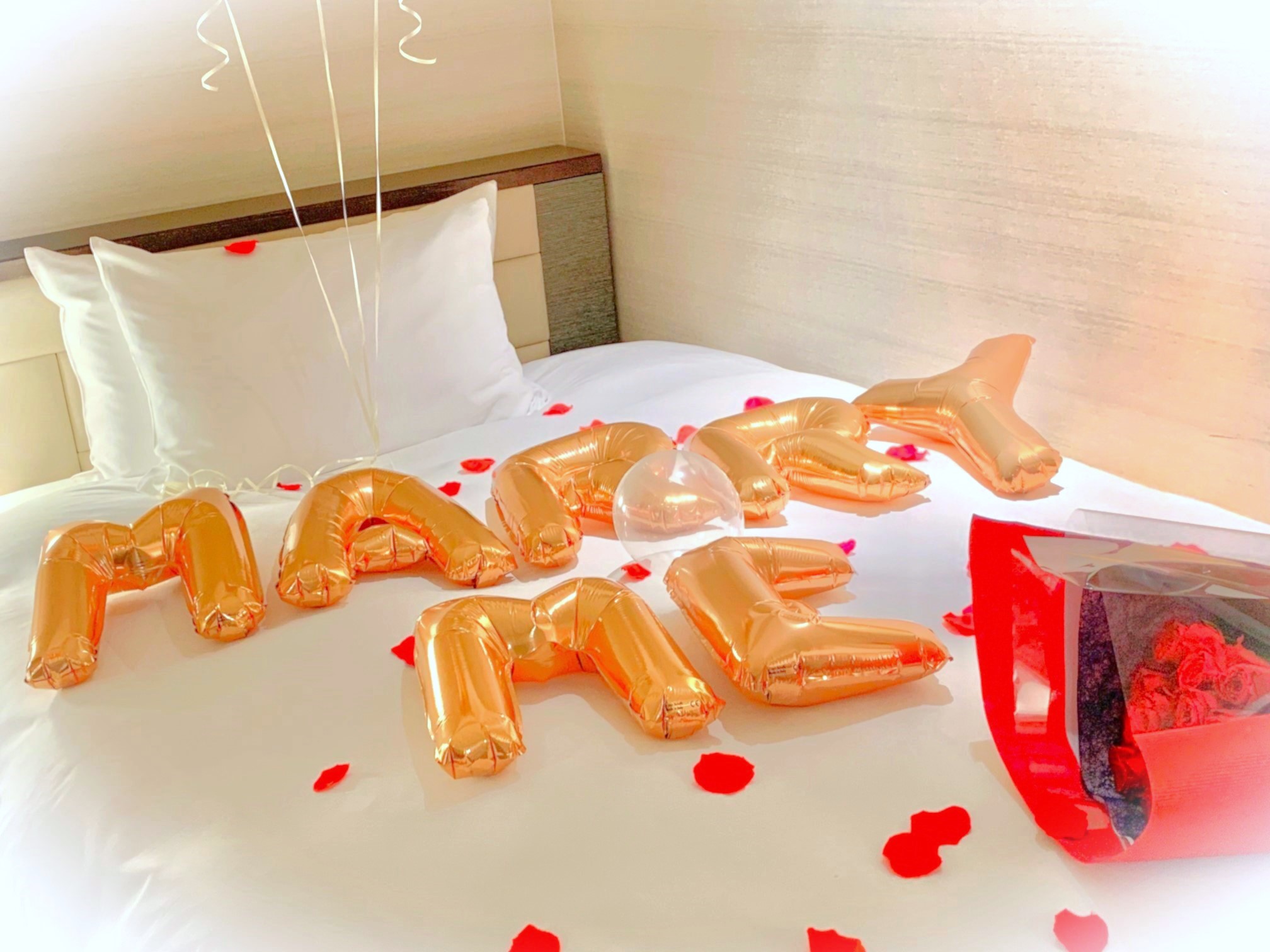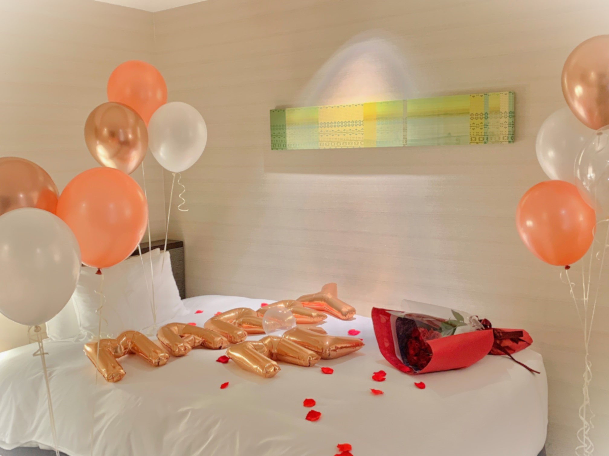 フリル状のフェイクの花びらで描くハートアートは手前のベッドに♡
