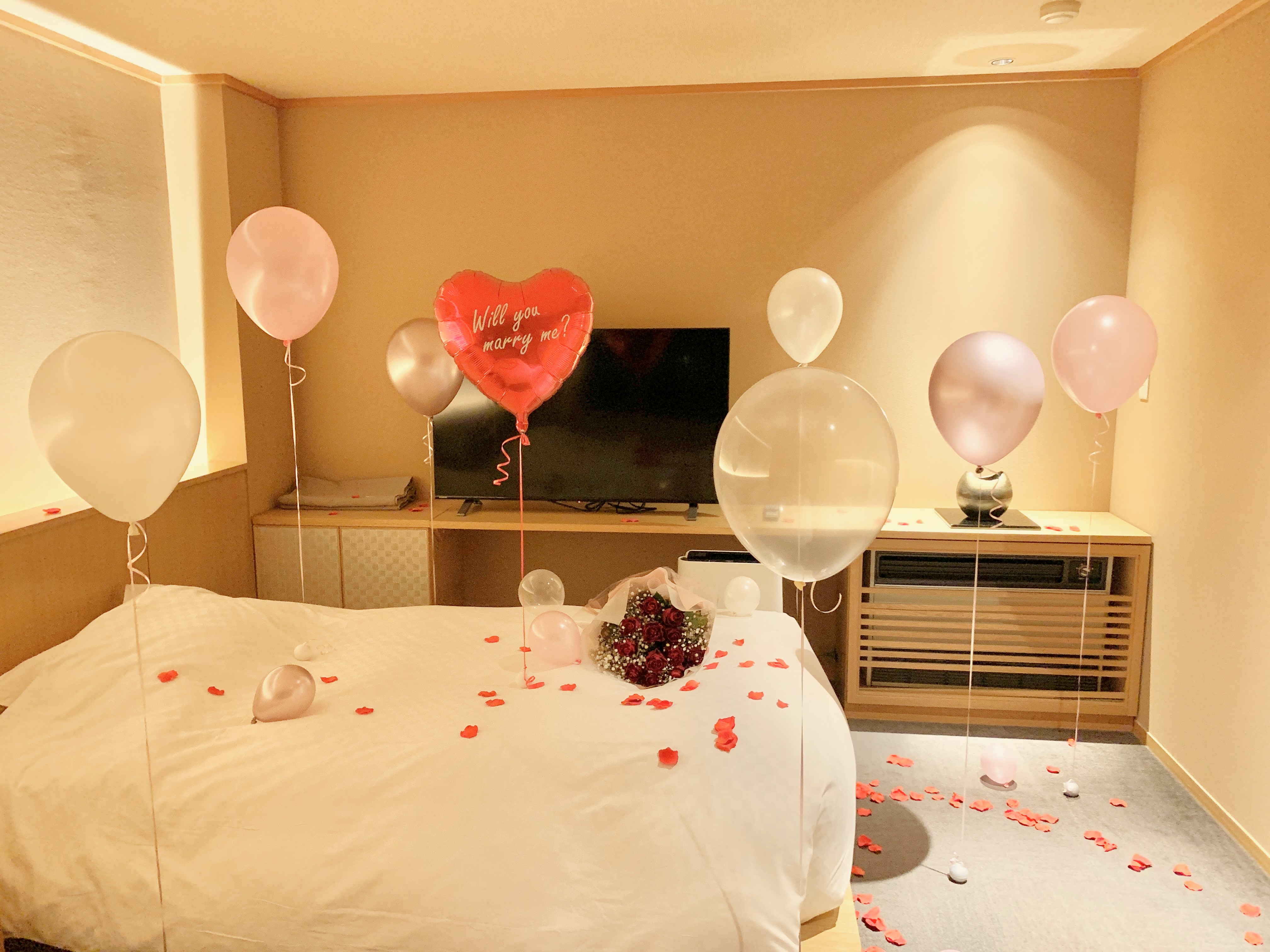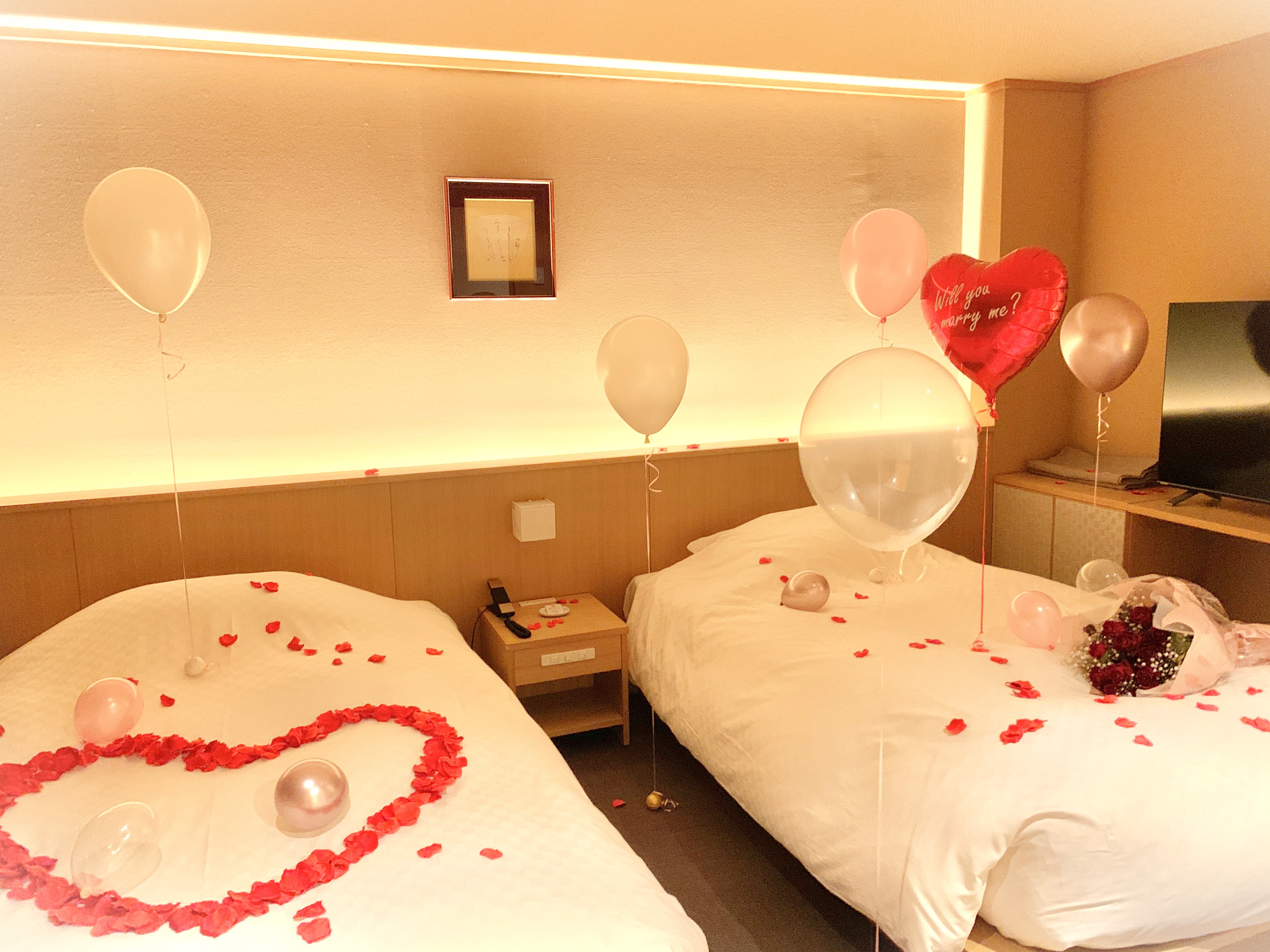 手前のベッドには花びらで大きなハート形を♡