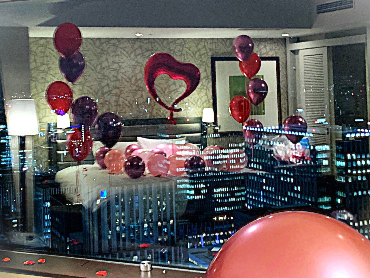 ベッド上の散りばめるバルーンは、パールピンクで軽やかさを!